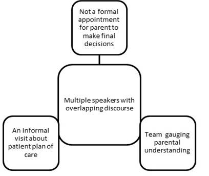At time stamp 2 the researcher noticed that the side conversation the nurse case manager (NCM) and the parent were having in Spanish was not interpreted for the rest of the English-speaking team. Yet at time stamp 3 there were parts of the discourse that were interpreted into English (when the source text was in Spanish), but other parts were not. During the post-consultation interview, when discussing these time stamps, the researcher asked Silvia what had impelled her to decide which utterances to interpret and which not when the NCM (a native Spanish speaker) and the parent engaged in a side conversation. Silvia stated that she perceived the appointment as an informal informative meeting with the objective of making the parent feel comfortable with the current plan for their child’s care. Silvia believed that the NCM was simply seeking clarification from the parent; therefore, she chose not to interpret their conversation. Furthermore, Silvia stated that she perceived the parent’s primary objective of the meeting to be to learn about the pain that can result from two different planned surgical procedures: surgical placement of a baclofen pump and an orthopaedic procedure.