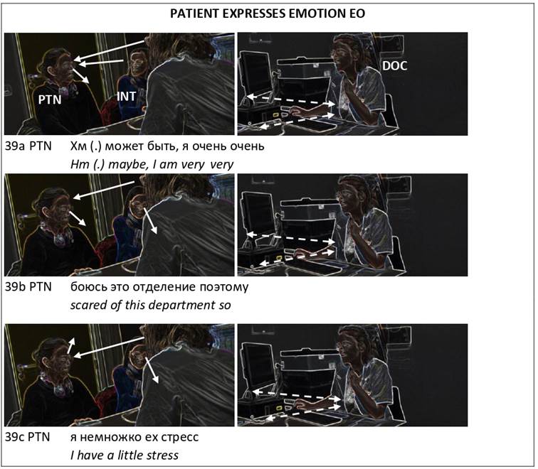 The excerpt where an emotion EO was expressed, rendered, and responded to is reproduced below. The interaction took place during a consultation between a doctor from the endocrinology department (DOC), a Russian-speaking Chechen patient (PTN), and a professional Dutch–Russian interpreter (INT). The reason for the encounter was that the patient had been diagnosed previously with thyroid cancer and surgery was planned to remove the thyroid gland. After that consultation, the patient cancelled the surgery. In the recorded consultation, the communication was centered on clarifying the patient’s reasons for cancelling the surgery, re-explaining the patient’s cancer diagnosis, and rescheduling the surgery.