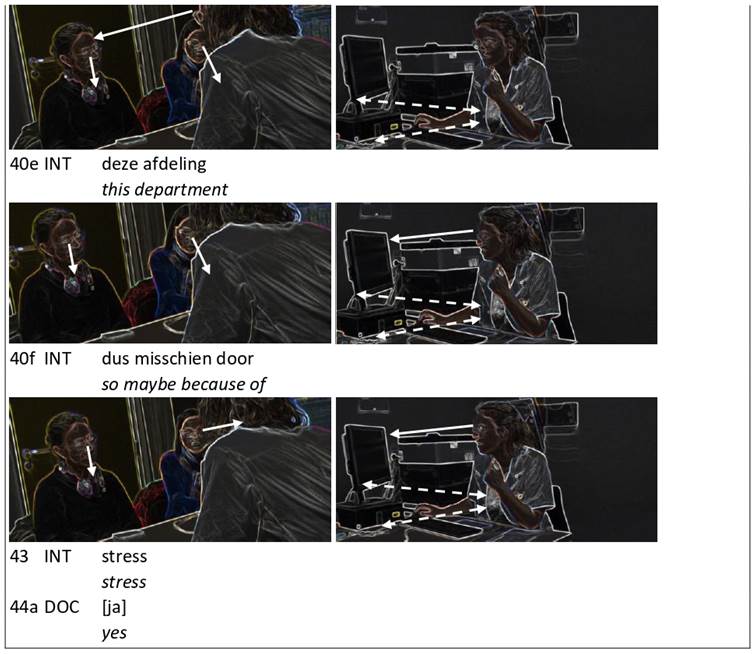 The video stills below show each shift in a participant’s gaze and/or body orientation. The direction of gaze is marked with a single full arrow and an engagement framework (mutual gaze) with a double full arrow. Body orientation is indicated with a single dotted arrow and a participation framework (participants’ mutually aligned body orientation) with a double dotted arrow. A participation and engagement framework is indicated with a large double arrow.