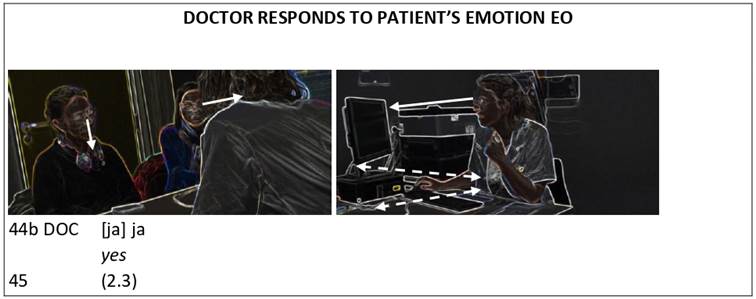 In what follows we discuss the way in which we applied the ECAF framework to our data. For reasons of space, we present only one excerpt of EC where the patient expresses an emotion, which the interpreter then renders and to which the doctor responds. This excerpt is taken from our dataset of seven real-life IMCs and is representative of all the identified excerpts in our dataset where the patient introduced an emotion EO. We do not claim that the findings based on this excerpt apply to EC across the board. To ascertain whether this will be the case, further research on a larger scale is required.