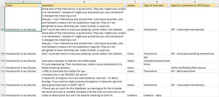 Given the experimental nature of the services provided by Aloud and the emphasis placed on viewers on their website (which features quotes from satisfied users), the analysis started by documenting the issues highlighted by YouTube users in their comments on the channel Amoeba Sisters en Español. To this end, all the comments included under the 29 videos posted on this channel were reviewed with the purpose of summarizing the main problems and positive comments highlighted by viewers. Each comment was entered in a spreadsheet and, in addition to indicating its authorship, the topics discussed were identified and recorded. If a comment discussed more than one issue, the issues were recorded separately by adding a new row (see Figure 1). As a result, the number of issues or topics identified exceeded the number of comments analysed.