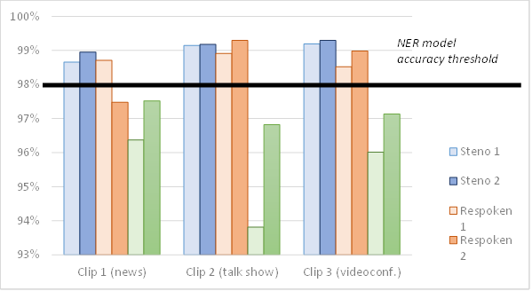 Beginning with steno captions, their accuracy reached 99.1% (7.5/10) on average and was “very good” according to the NER model. The news samples showed a slightly lower accuracy rate than those of the talk show and the videoconference (98.8%, 99.2%, and 99.2%, respectively). But all the captioning samples scored well above the 98% accuracy threshold.