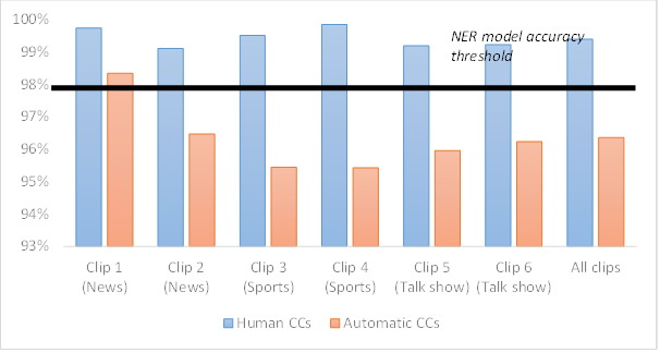 The human closed captions delivered on television boasted a 99.4% (8.5/10) average accuracy rate for the news samples, 99.6% (9/10) for the sports segments, and 99.2% (8/10) for the talk shows. All the human samples scored above 99.1% and, according to the NER model, the closed captions accompanying the news and talk show programmes would be “very good”, while those from the football game would have an “excellent” accuracy.