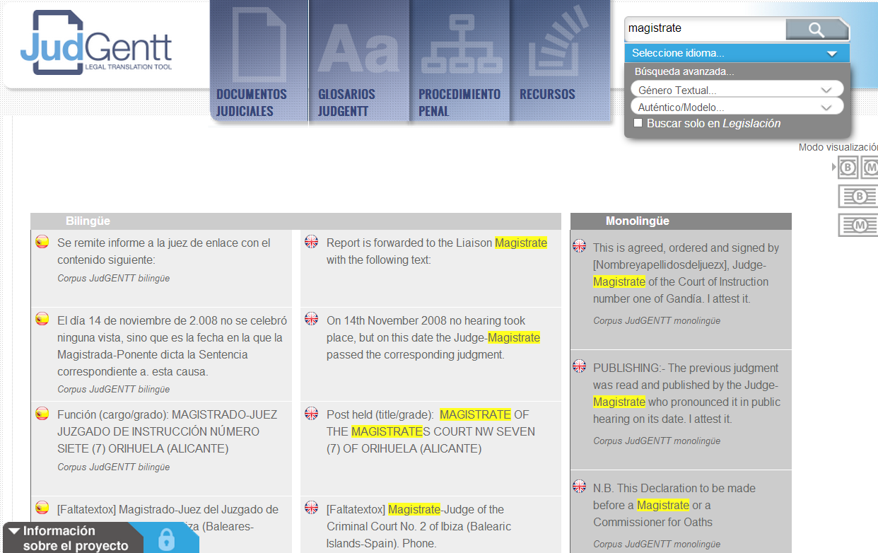 This article describes an action research project on multilingual management and translation of court documents developed by the GENTT research group, which postulates that the notions of ‘textual genre’, ‘genre system’ and ‘meta-genre’ can be powerful tools for accessing and ‘reusing’ the linguistic and extra-linguistic information technical writers and translators need to manage specialised communication. To validate this hypothesis the criminal court genre systems of four countries (Germany, Spain, France and the United Kingdom) have been analysed and described from a legal-conceptual, discursive-textual and terminological perspective. The results of this contrastive analysis have been used as the basis for creating translation resources (both conceptual and linguistic), which have been organised into an online platform for translators of court documents. This platform is conceived as a knowledge system which will permit the ‘reusability’ of electronic translation resources. Our approach presents an integrative methodology for research into legal translation.